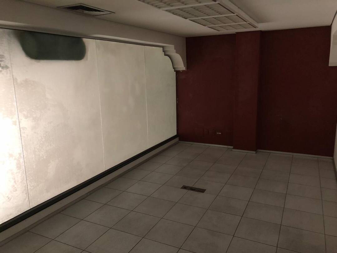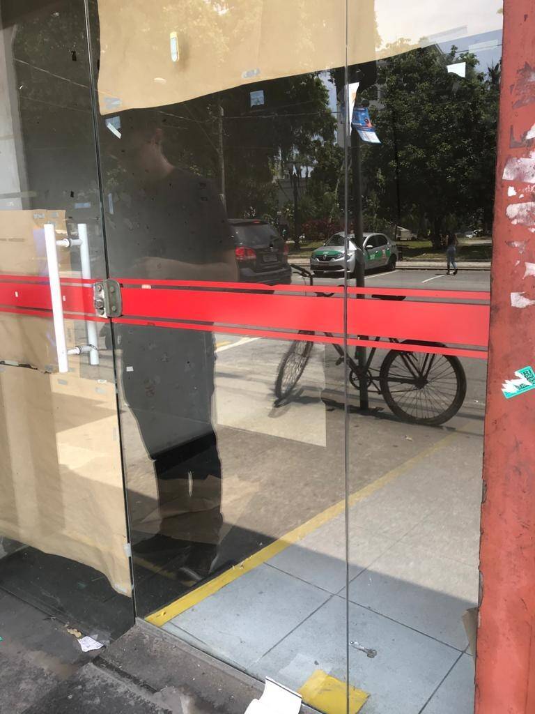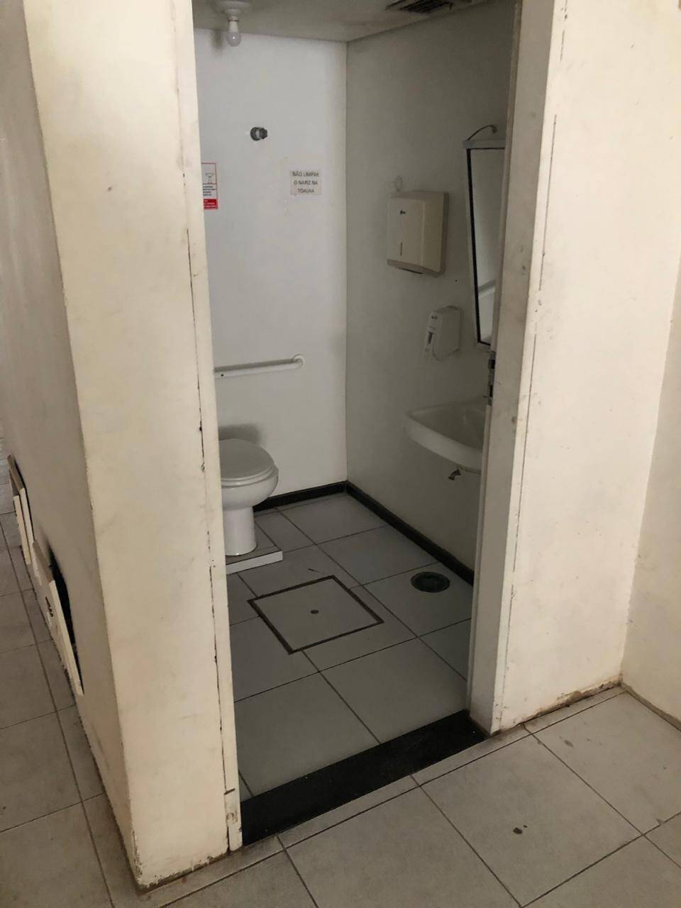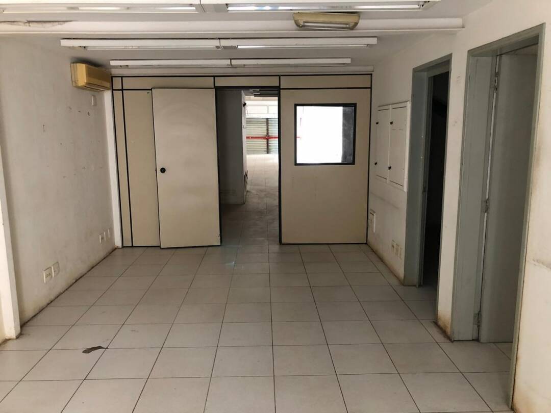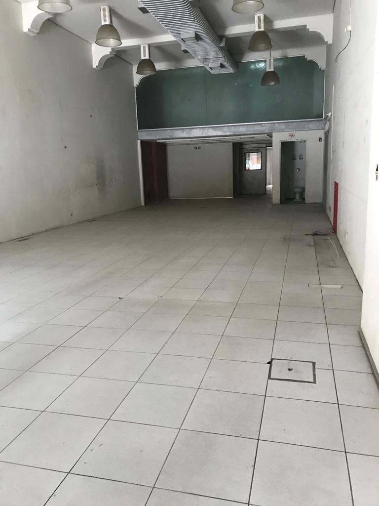 Primeiro andar: loja grande com banheiro acessível, porta de vidro e de aço em perfeito funcionamento na entrada, instalação para banco com tomadas no chão, instalação elétrica nova