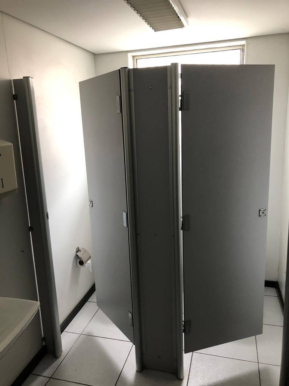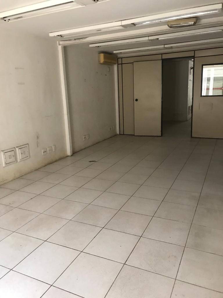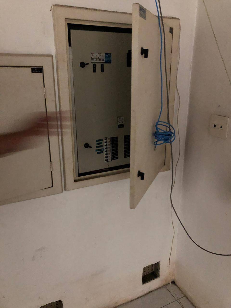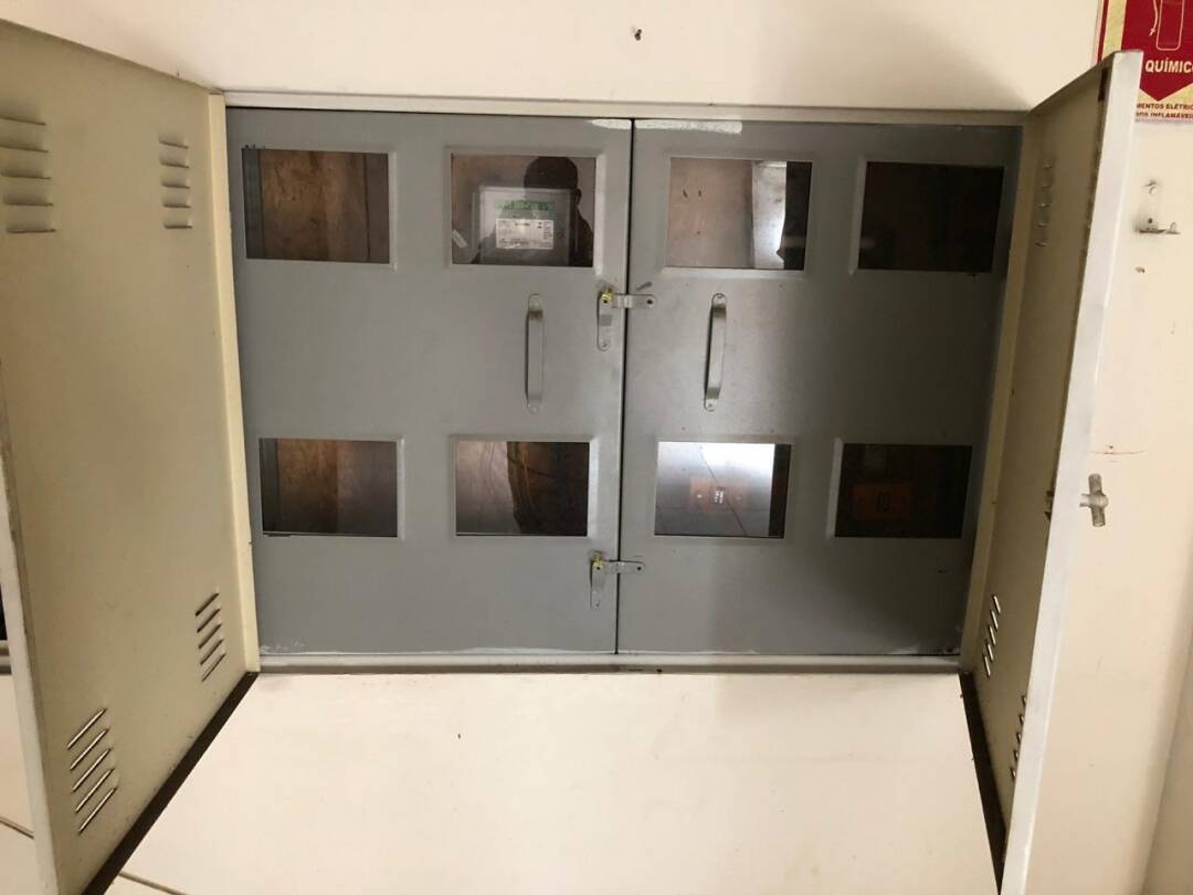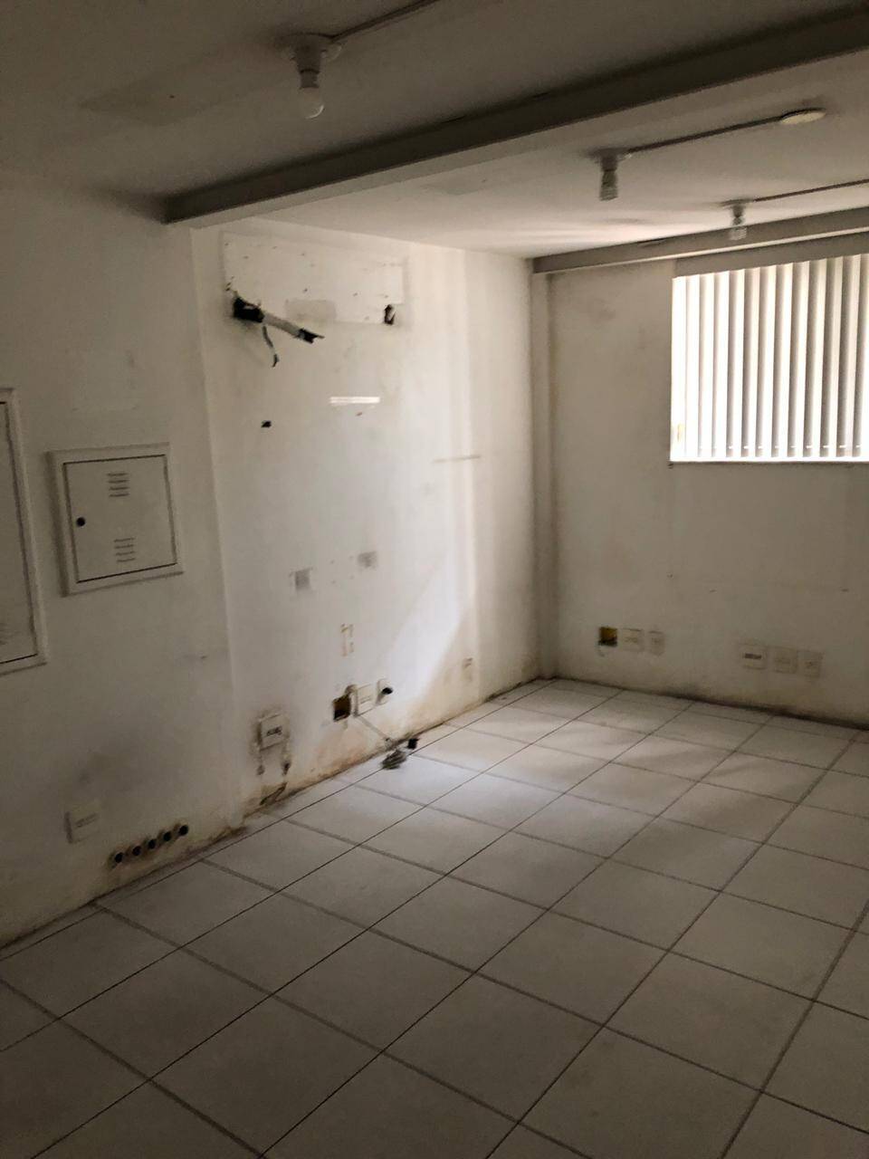Primeiro andar: loja grande com banheiro acessível, porta de vidro e de aço em perfeito funcionamento na entrada, instalação para banco com tomadas no chão, instalação elétrica nova