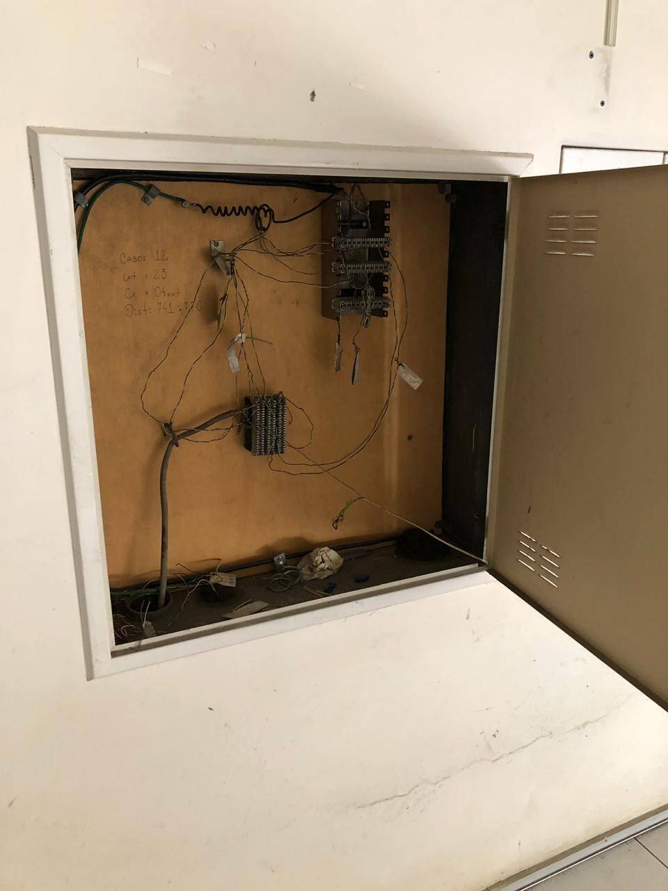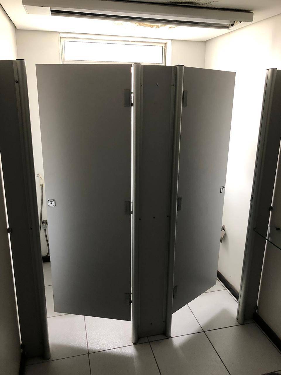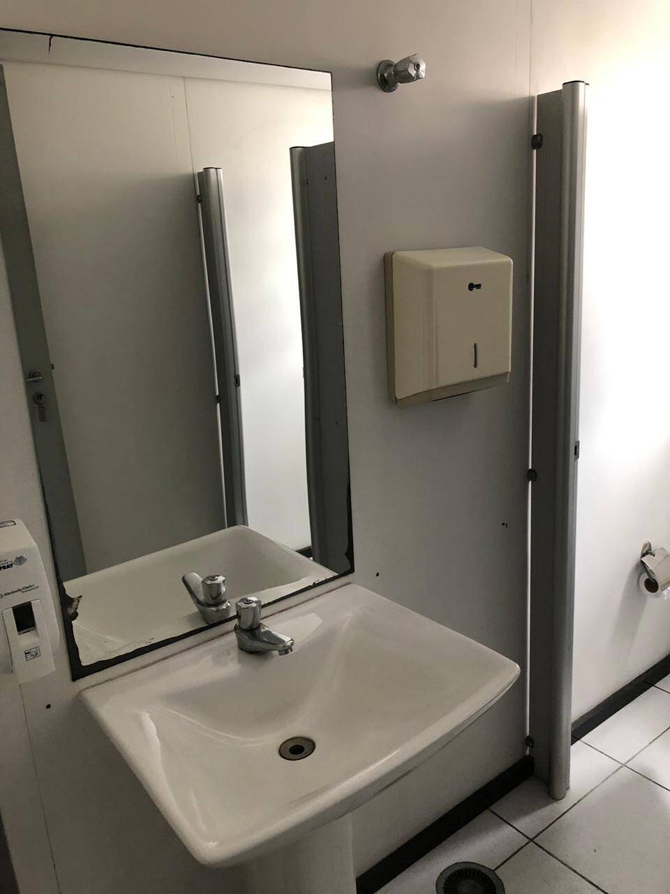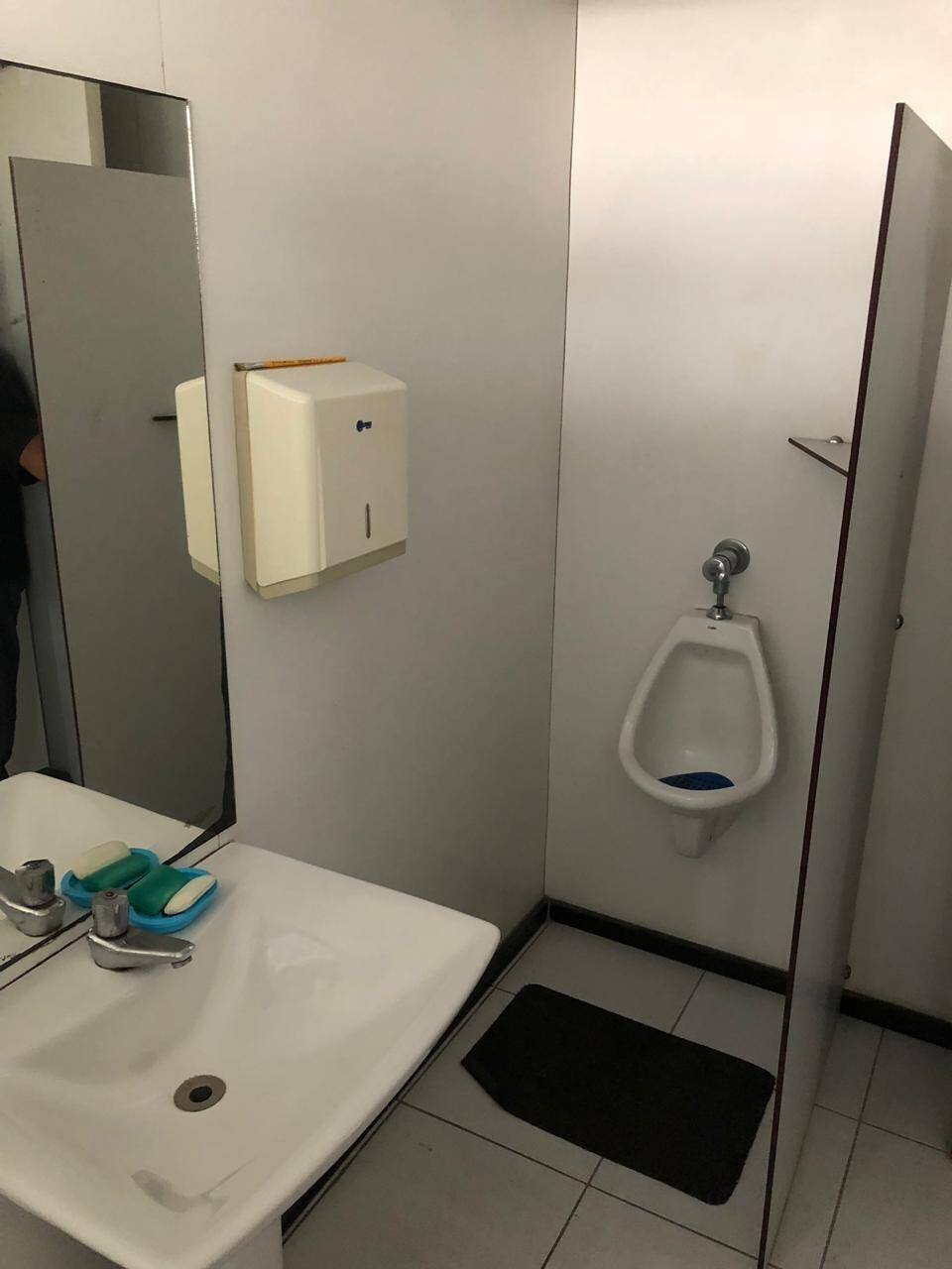 Primeiro andar: loja grande com banheiro acessível, porta de vidro e de aço em perfeito funcionamento na entrada, instalação para banco com tomadas no chão, instalação elétrica nova